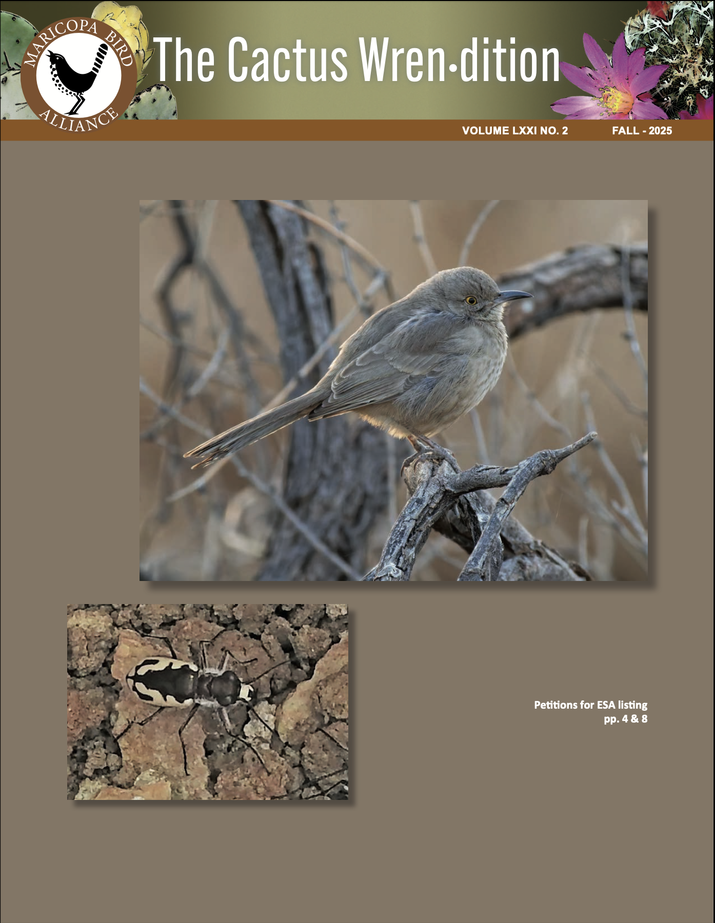 The Cactus Wren·dition newsletter is printed four times a year, and contains field trip schedules, meeting information, notes on local birds and hotspots, conservation information and advisories, and much, much more! Subscriptions are included with all Maricopa Audubon Society (MAS) chapter memberships, and are available for only $6/year for other chapter members. Digital issues are free to the public and available about a month after distribution of the hardcopy to members. Higher resolution photographs are alone worth the hardcopy. Click here to join MAS.